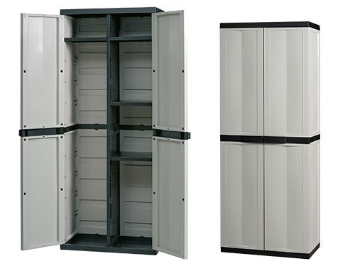 In resina; resistente al gelo e alle intemperie; 2 ante lucchettabile; vano portattrezzi; 4 piani regolabili. Colore grigio. Dimensioni L65xP37xH165 cm.
