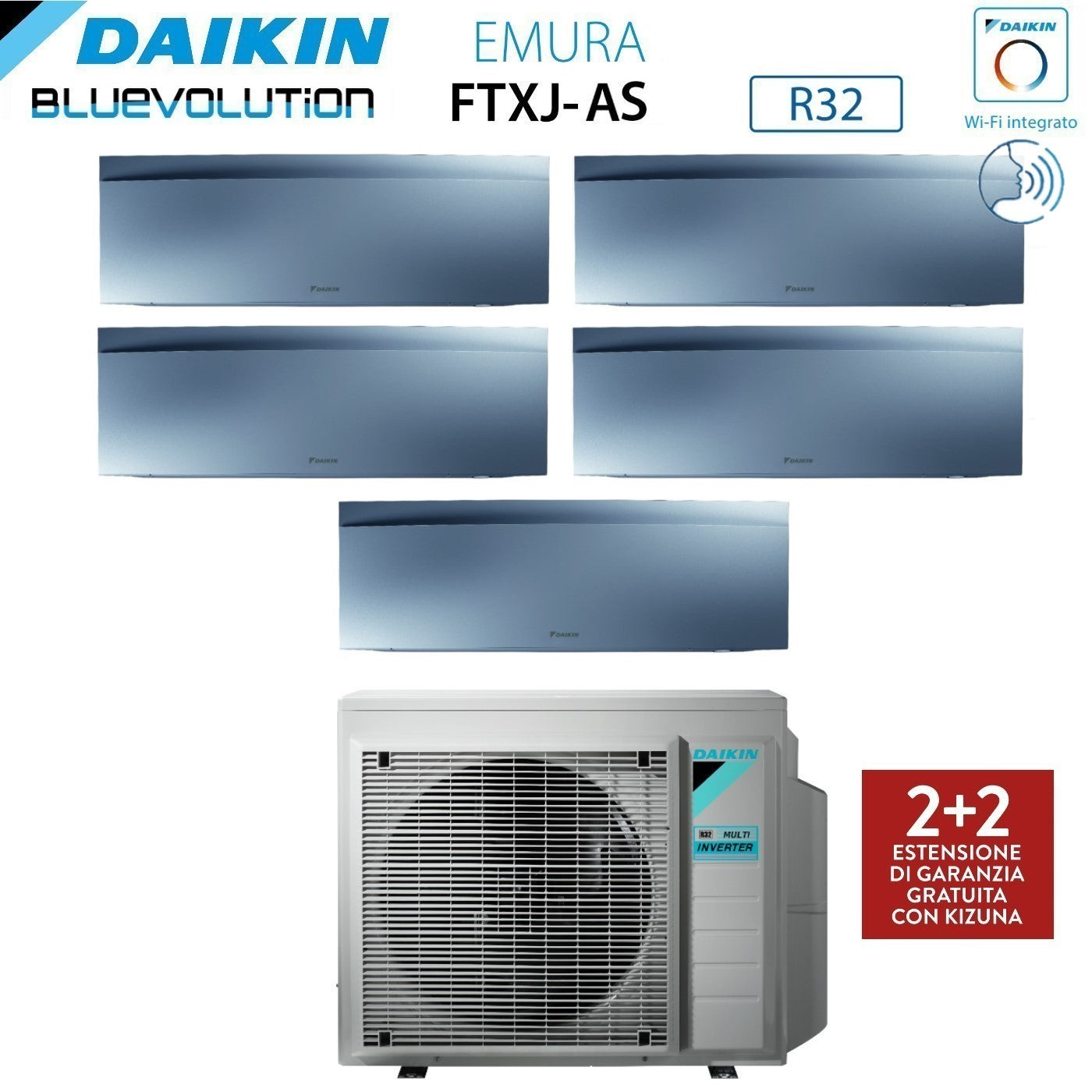 Daikin Bluevolution Penta Split Inverter Airconditioner EMURA SILVER III serie 9+9+9+9+9+9 met 5MXM90N R-32 Geïntegreerde Wi-Fi 9000+9000+9000+9000+9000 Zilveren kleur