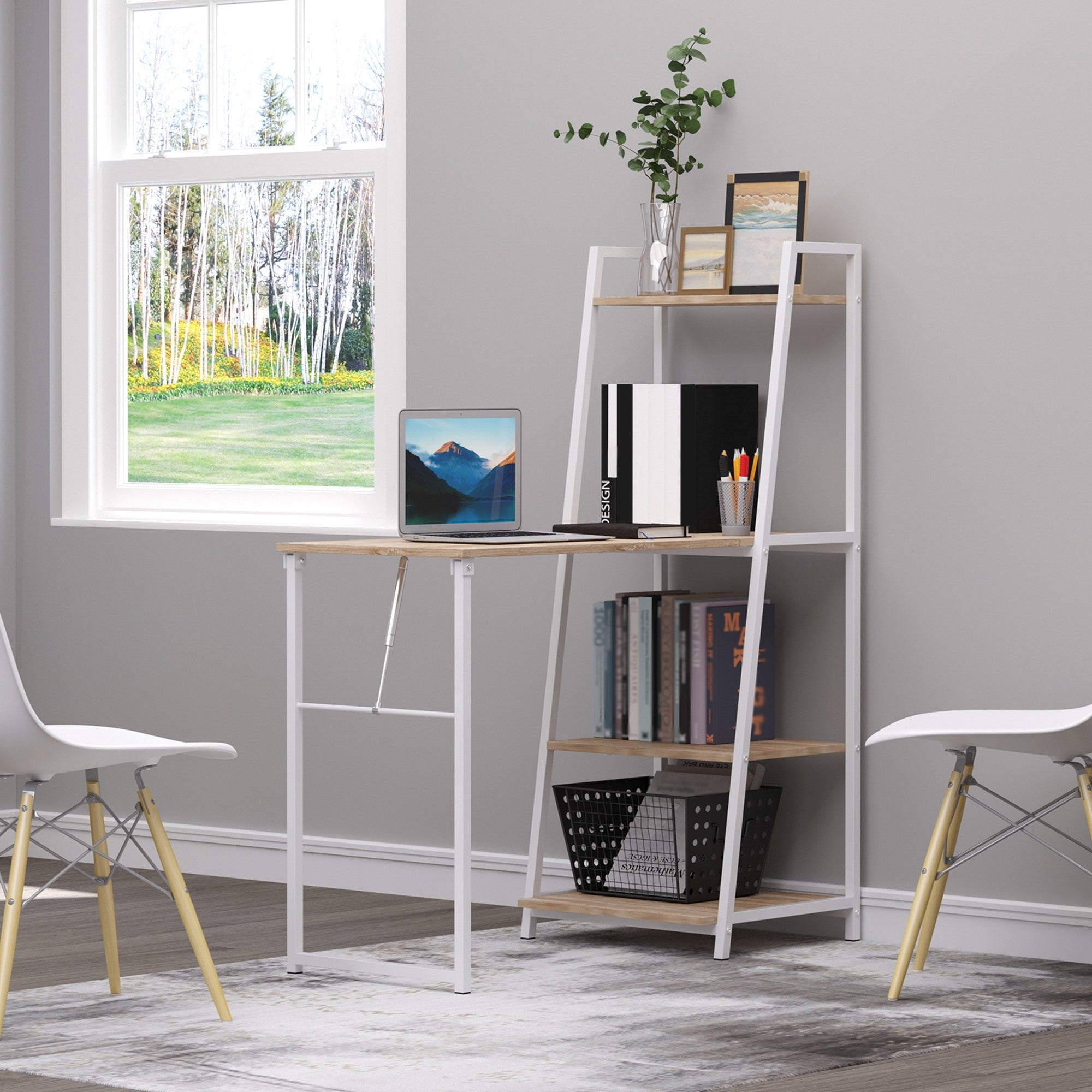 Easycomfort Flat Desk met boekenplanken Bespaar ruimte in wit metaal en hout MDF kleur Rovere, 106x48x128cm