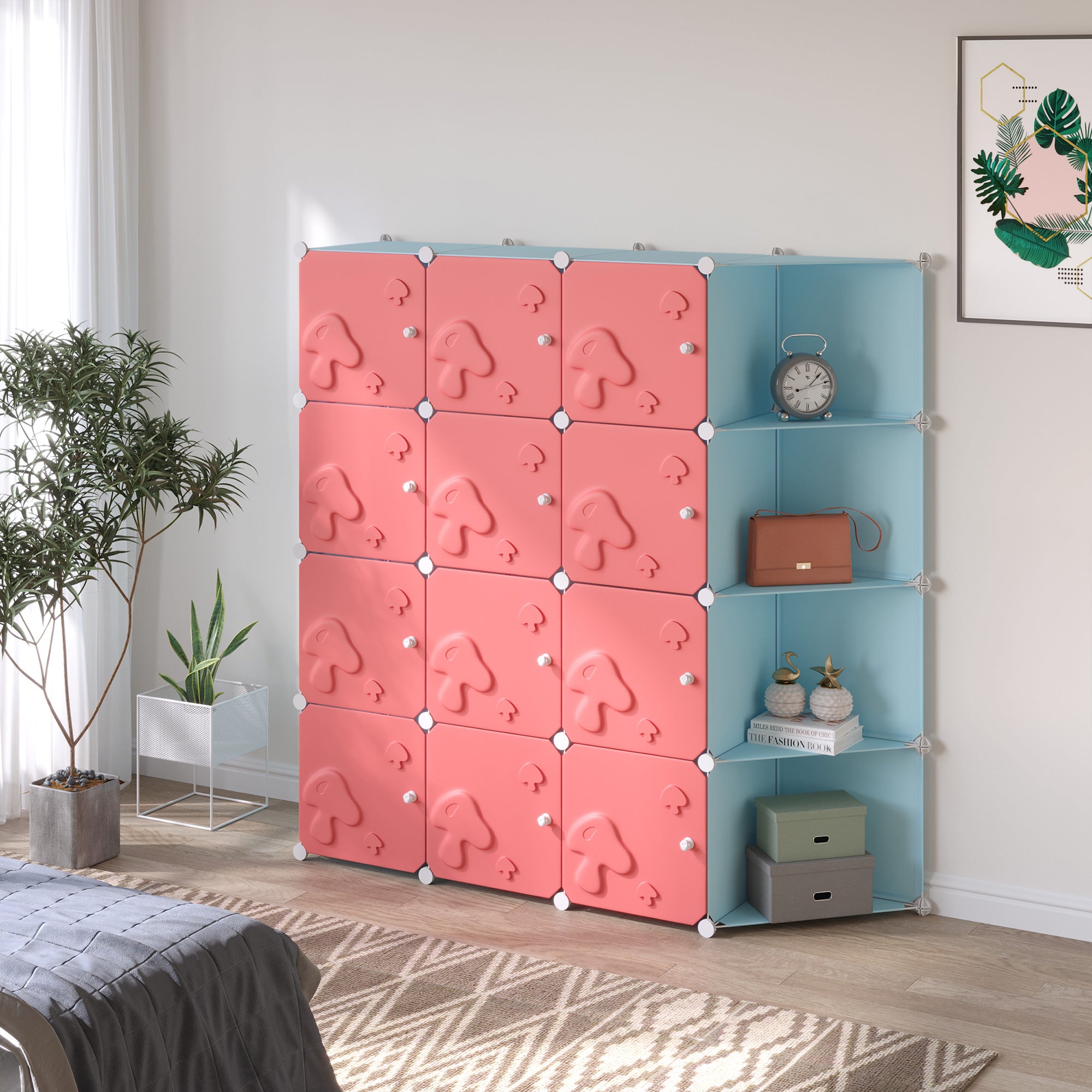 Make an order at home efficiently with this cubic scarf furniture. The cubes can be wrapped by free choice, making them ideal to fit without any problem to spaces of any size and shape. The 16 cubes offer a lot of space to accumulate toys, threads, clothes, shoes and other objects to keep the house ordered and organized. A great accessory for your home!Caracteristics:• Design with mushroom motifs• Ideal space saving accessory for limited spaces• The magnetic door easily closes and keeps the dust away• Made of PP plastic and steel structure• Anti-corrosion design• Wide space for clothes, shoes, toys etc• Simple assemblyTechnical data:• Color: Pink• Material: PP, Steel• Overall Dimensions: 145L x 145A x 145A•Square box Dimensions: 35L x 45A 35A