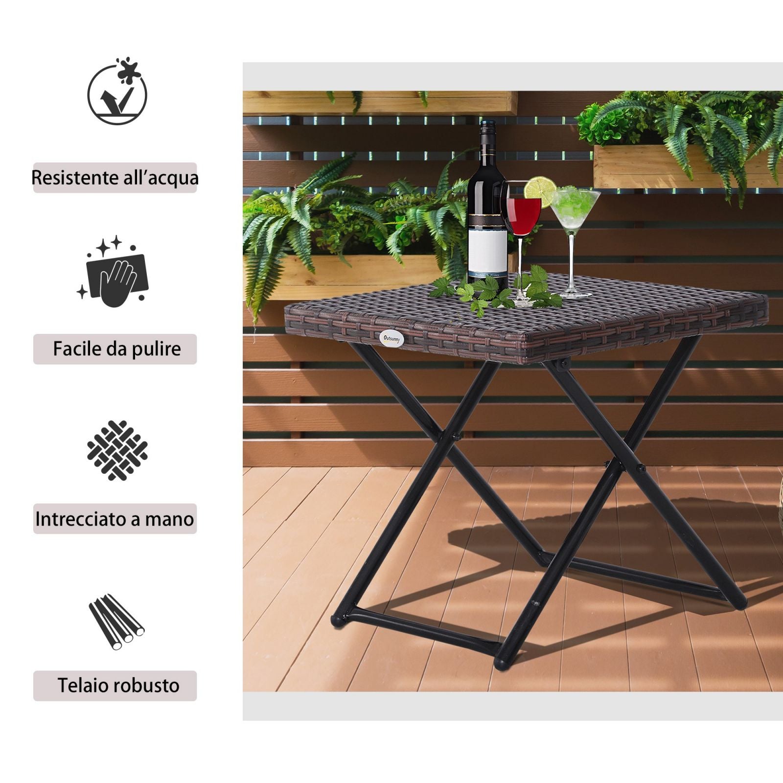 De opklapbare tafel is een elegant en praktisch meubelstuk dat niet mag ontbreken in huis en tuin. Deze salontafel van synthetisch rotan is ideaal voor het plaatsen van drankjes, snacks en alles wat u maar binnen handbereik wilt houden. Het stalen frame en PE-rotan zijn solide en zorgen voor een lange levensduur. Kies deze opklapbare tuintafel als uw assistent tijdens ontspannende momenten buitenshuis! Kenmerken – Corrosiewerend gepoedercoat metalen frame – Ruimtebesparend opvouwbaar ontwerp – Lichtgewicht voor gemakkelijk dragen – Handgeweven PE-synthetisch rotan, kleurvast en gemakkelijk schoon te maken – Geschikt voor elke omgeving, thuis en in de tuin – Geen montage vereist, de tafel wordt gebruiksklaar geleverd Technische gegevens – Kleur: Bruin – Materiaal: Metaal, PE-rotan – Algemene afmetingen: 40L x 40P x 40Acm – Afmetingen opgevouwen: 40L x 6D x 55Acm – Gewicht: 30kg 'peso: 12.0coted: 12.0coted: ITAT1573