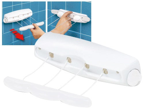 In resina a parete con fili retraibili automaticamente. Dotato di sistema di bloccaggio dei fili e aggancio a parete appenditutto. Dimensioni aperto 360x41x9 cm. – 6 fili – 21 metri da stendere